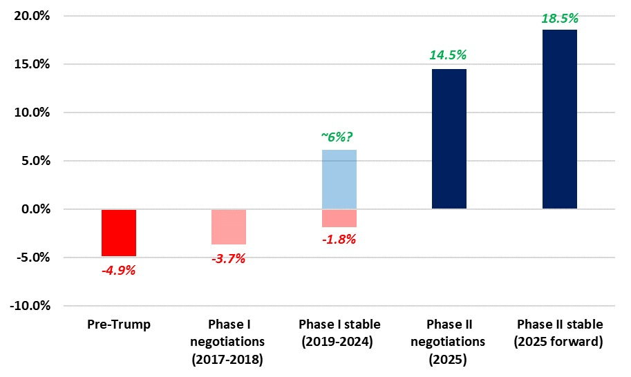 Notes: 1. Trade-weighted tariff rates in 2016 were 8.0% on US exports to China vs 3.9% on imports; 2. While the notional differential achieved in Phase I was -1.8%, in reality China unofficially suspended many import duties leading to a positive differential under Trump’s first administration; 3. 2025 forward numbers based on latest round of negotiations ending May 2025.