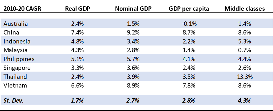 For a start, whilst real GDP numbers look somewhat comparable and almost clustered towards the 4%-6% range, this becomes markedly less so when looking at other metrics, and the standard deviation shows this. These others are important, too: we look at nominal GDP from an investment perspective because earnings and returns are nominal, not real. Per capita numbers wash out the effects of rapid population growth as an artificial bolster for underlying growth. Middle class population tell us how any of this notional growth is actually converting into mass consumers.