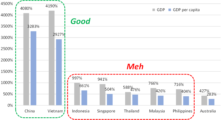 It turns out there are really only two groups of economies in emerging Asia: those that have generated huge amounts of growth and those which are just trundling along. China and Vietnam come from different bases but share the enormous benefits of a post-Communist economic surge; almost everyone else is unremarkable – both developed Singapore and Australia are not all that different to supposed stars such as Indonesia, Malaysia or the Philippines. China and Vietnam have performed not just better, but better by an order of magnitude.